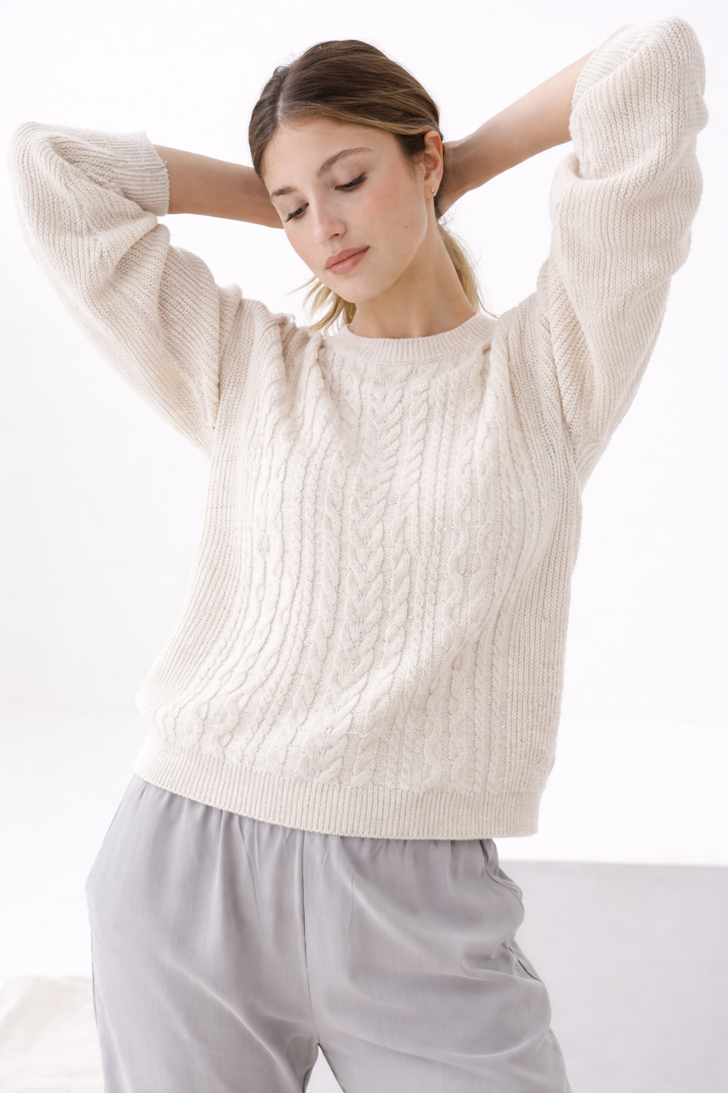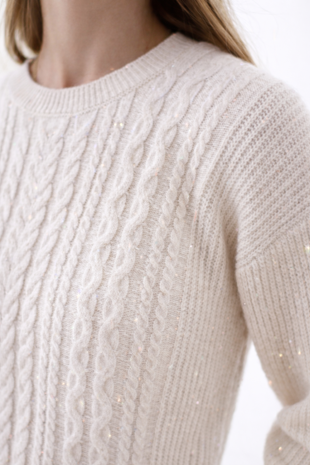 Sweater tejido de textura suave, con diseño de trenzas que aporta relieve y un estilo clásico renovado. Incorpora sutiles brillos que le dan un toque delicado y luminoso. De calce cómodo, con cuello redondo y terminaciones en rib, es una prenda ideal para sumar abrigo y elegancia a tus looks de invierno.